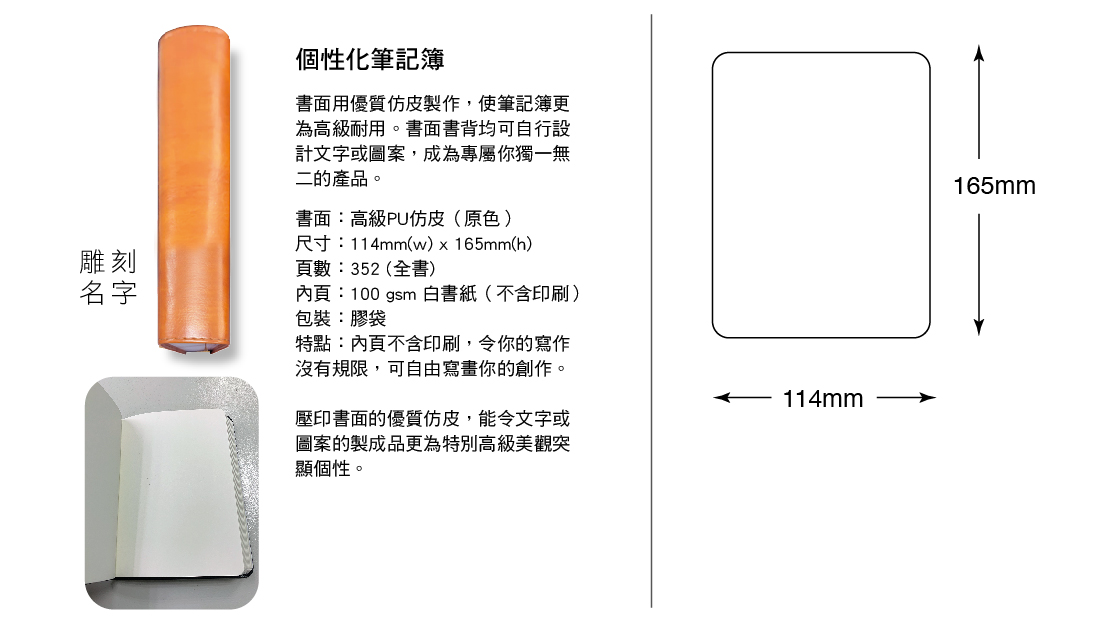 可個性化設計筆記本封面圖案,及書脊鐳射刻字,